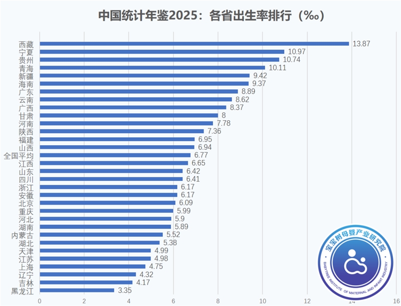 下沉市場(chǎng)構(gòu)成出生人口基本盤(pán):根據(jù)《中國(guó)統(tǒng)計(jì)年鑒2025》的分省份數(shù)據(jù),出生率呈現(xiàn)清晰的區(qū)域差異。在31個(gè)省份中,城鎮(zhèn)化后半程的中西部省份和華南地區(qū)出生率高于全國(guó)均值,其中10個(gè)省份突破8‰大關(guān)[1],這些地區(qū)城鎮(zhèn)化率尚有空間(多在60%以下),傳統(tǒng)的家庭觀念更強(qiáng),生育成本相對(duì)較低,構(gòu)成了出生人口的“數(shù)量基礎(chǔ)盤(pán)”。