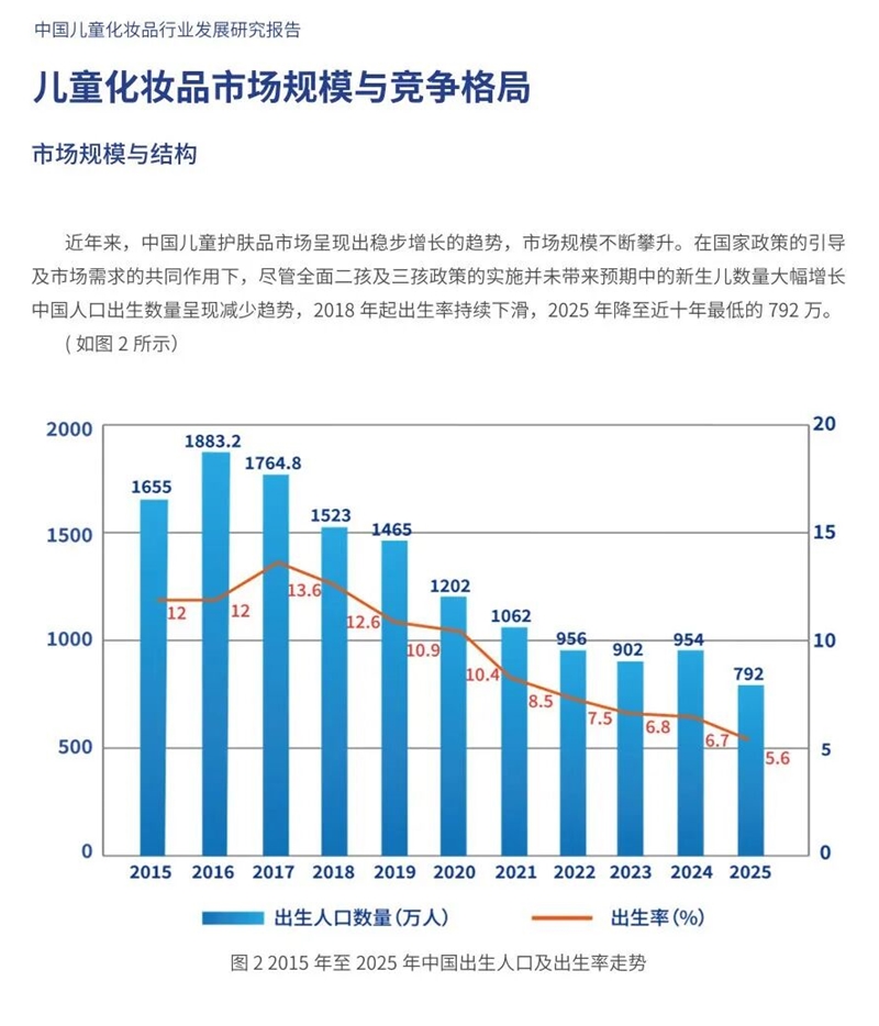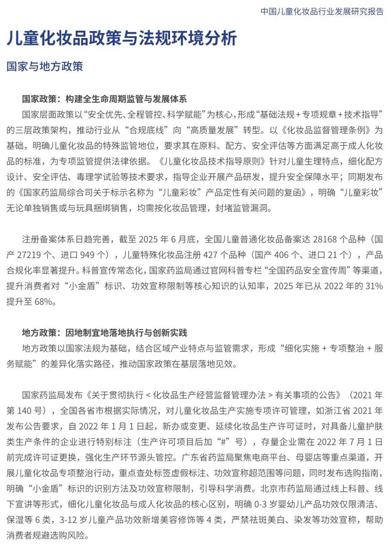 通過文獻(xiàn)研究、現(xiàn)場(chǎng)調(diào)研、專家研討等方法,《報(bào)告》充分展現(xiàn)了中國兒童化妝品行業(yè)發(fā)展沿革、現(xiàn)狀,提出未來趨勢(shì)與發(fā)展建議?!秷?bào)告》指出,隨著我國經(jīng)濟(jì)社會(huì)快速發(fā)展和“精致育兒”理念的普及,兒童化妝品市場(chǎng)呈現(xiàn)出蓬勃發(fā)展的態(tài)勢(shì)。截至2025年6月底,兒童普通化妝品備案28168個(gè)品種,其中國產(chǎn)27219個(gè),進(jìn)口949個(gè);兒童特殊化妝品注冊(cè)427個(gè)品種,其中國產(chǎn)406個(gè),進(jìn)口21個(gè)。隨著化妝品監(jiān)管體系不斷完善,注冊(cè)備案制度改革不斷深化,我國兒童化妝品安全形勢(shì)穩(wěn)中向好,市場(chǎng)規(guī)模迅速增長(zhǎng)。同時(shí),隨著精致育兒和消費(fèi)升級(jí)的轉(zhuǎn)型,兒童化妝品規(guī)范化程度顯著提升,日益滿足多元化的消費(fèi)需求。