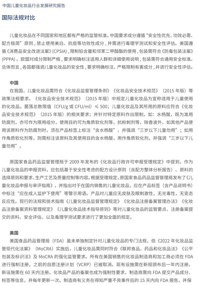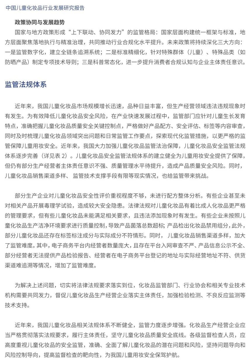《報(bào)告》指出,中國兒童化妝品行業(yè)產(chǎn)品呈現(xiàn)“分齡化、場(chǎng)景化、智能化”趨勢(shì)。其中,場(chǎng)景化創(chuàng)新已經(jīng)成為兒童化妝品品牌打破同質(zhì)化競(jìng)爭(zhēng),深入洞察用戶真實(shí)需求的關(guān)鍵路徑。展望未來,《報(bào)告》指出,為推動(dòng)行業(yè)持續(xù)健康發(fā)展,需進(jìn)一步強(qiáng)化監(jiān)管體系的法治化與國際化建設(shè),以技術(shù)創(chuàng)新融合突破核心瓶頸,加大成分與溯源體系建設(shè),重構(gòu)兒童化妝品全生命周期質(zhì)量管理體系,在研發(fā)與質(zhì)量的雙輪驅(qū)動(dòng)下,深入開展合規(guī)實(shí)踐和管理創(chuàng)新,助力民族品牌加速全球化布局,通過線上線下融合構(gòu)建無縫化消費(fèi)生態(tài),共同推動(dòng)中國兒童化妝品行業(yè)持續(xù)健康發(fā)展。